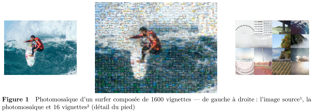 Une photomosaïque (figure 1) est une image composée à la manière d’une mosaïque, où les fragments sont eux-mêmes des petites images, appelées vignettes. Elle est créée à partir d’une image appelée image source. Chaque vignette remplace une zone de même forme dans l’image source appelée pavé. Les vignettes sont fabriquées à partir d’une collection d’images appelée banque d’images.